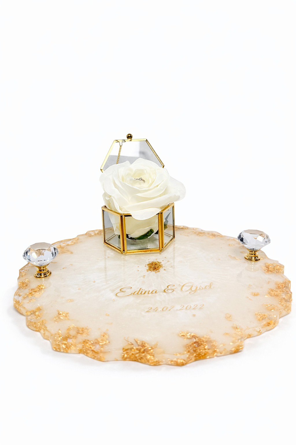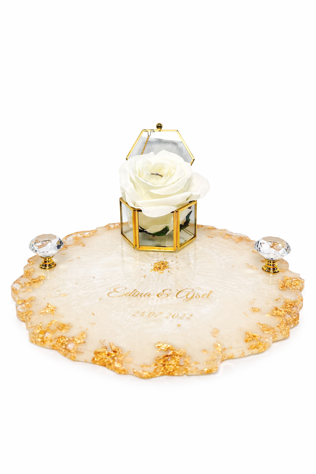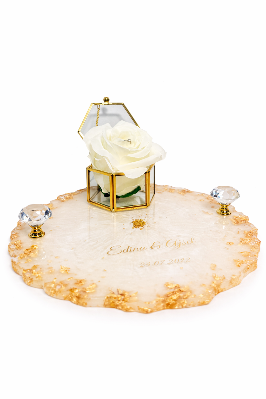 Lieferumfang: Ringtablett mit zwei Griffen, zwei Glasboxen (7.5cm/4.5cm) mit je einer Kunstblume inkl. personalisiertem Aufdruck